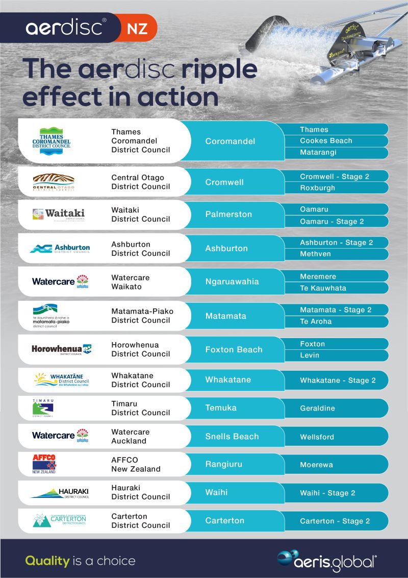 So far, 12 of 19 District Councils in the South Island have aerdisc® Directional Aerators either in operation, or in progress. Just 26-months after the